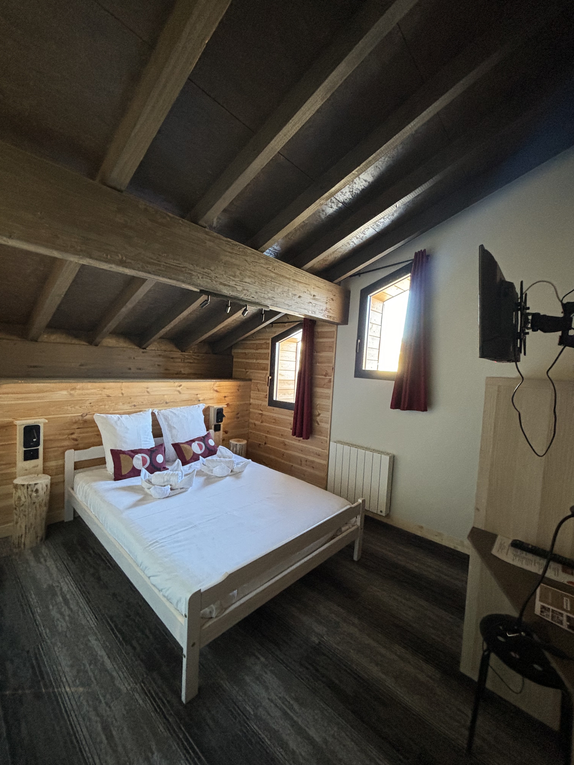 Cette chambre triple côté montagne vous accueille dans une ambiance chaleureuse et authentique, inspirée du style montagnard. Parfaite pour un séjour entre amis ou en famille, elle offre une vue apaisante sur les massifs environnants.
